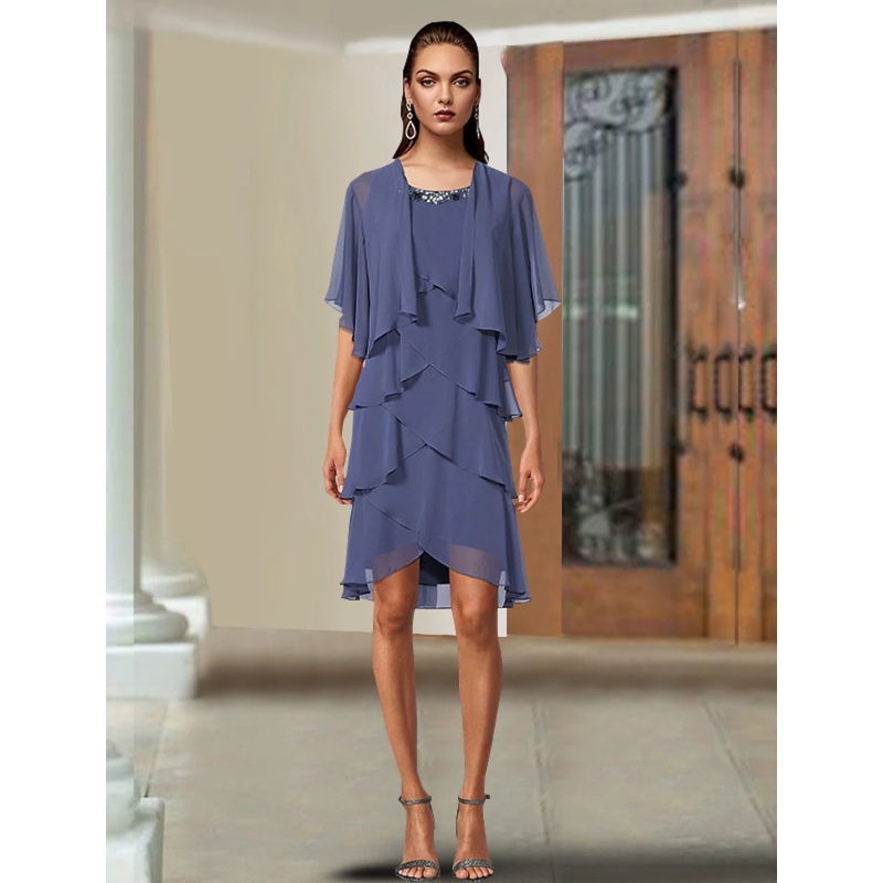 Be the first to review “Two Piece A-Line Mother of the Bride Dress Elegant Jewel Neck Knee Length Chiffon Sleeveless Wrap Included with Beading Sequin Ruffles”