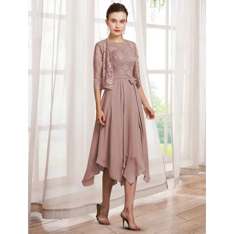 Be the first to review “Two Piece A-Line Mother of the Bride Dress Elegant Jewel Neck Tea Length Chiffon Lace Half Sleeve Wrap Included with Sash / Ribbon”