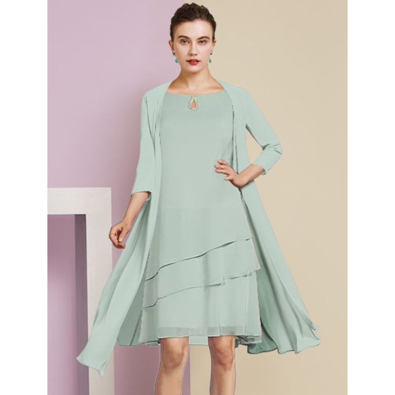 Two Piece A-Line Mother of the Bride Dress Formal Wedding Guest Elegant Scoop Neck Knee Length Chiffon 3/4 Length Sleeve with Tier