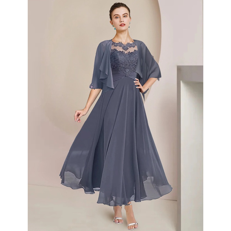 Be the first to review “Two Piece A-Line Mother of the Bride Dress Formal Wedding Guest Elegant Scoop Neck Tea Length Chiffon Lace 3/4 Length Sleeve Wrap Included with Appliques Ruching”