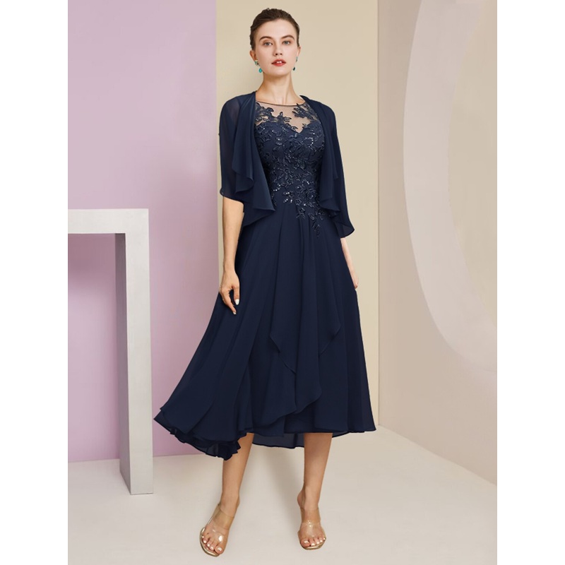 Two Piece A-Line Mother of the Bride Dress Formal Wedding Guest Elegant Scoop Neck Tea Length Chiffon Lace Short Sleeve Fall Wrap Included with Pleats Sequin Appliques