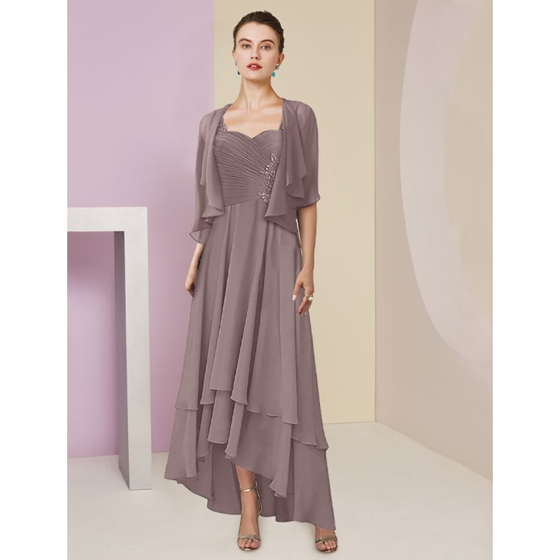 Be the first to review “Two Piece A-Line Mother of the Bride Dress Formal Wedding Guest Elegant Square Neck Asymmetrical Tea Length Chiffon Lace 3/4 Length Sleeve Wrap Included with Ruched Tier Appliques”