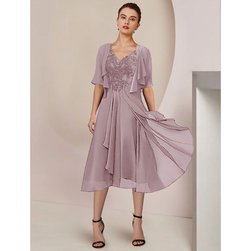 Two Piece A-Line Mother of the Bride Dress Formal Wedding Guest Elegant V Neck Asymmetrical Tea Length Chiffon Lace Short Sleeve Wrap Included with Pleats Appliques