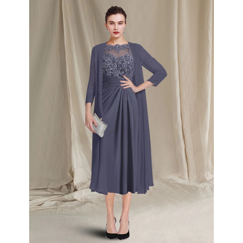 Be the first to review “Two Piece A-Line Mother of the Bride Dress Plus Size Elegant Jewel Neck Tea Length Chiffon Lace Half Sleeve Jacket Dresses with Crystals Appliques”