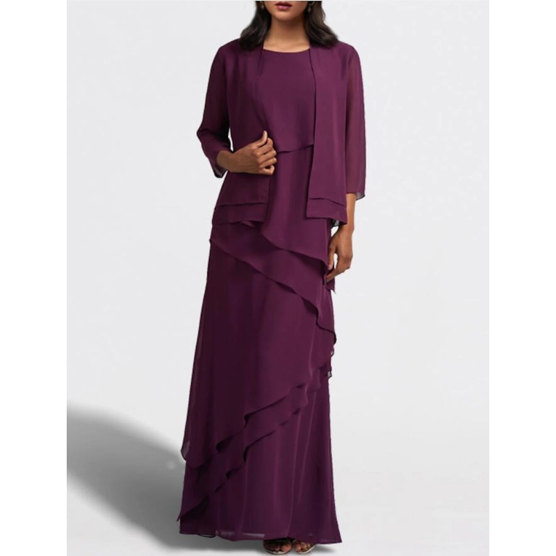 Two Piece A-Line Mother of the Bride Dress Wedding Guest Elegant Jewel Neck Floor Length Chiffon Sleeveless Wrap Included with Cascading Ruffles Solid Color