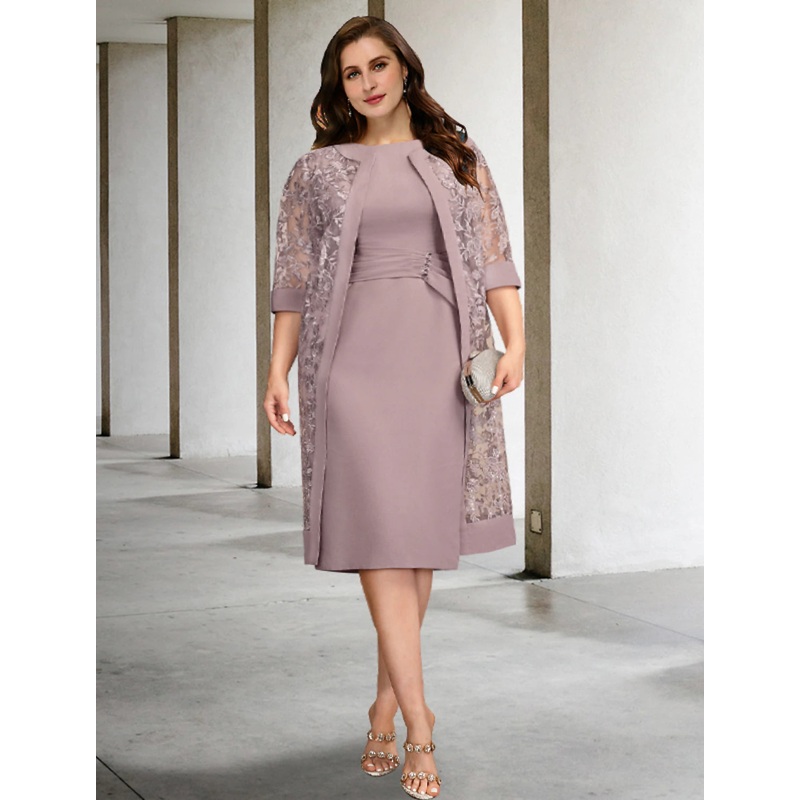 Two Piece A-Line Mother of the Bride Dresses Plus Size Hide Belly Curve Elegant Dress Formal Knee Length Short Sleeve Jewel Neck Chiffon with Ruched Overskirt Strappy