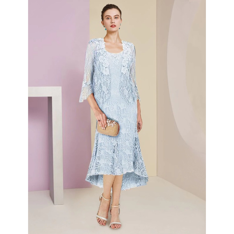 Two Piece Mermaid / Trumpet Mother of the Bride Dress Formal Wedding Guest Elegant High Low Scoop Neck Asymmetrical Tea Length Lace Sleeveless Wrap Included with Solid Color
