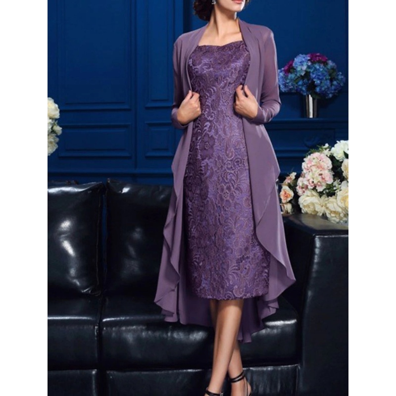 Be the first to review “Two Piece Sheath / Column Mother of the Bride Dress Church Elegant Jewel Neck Knee Length Chiffon Lace Long Sleeve Jacket Dresses with Appliques”