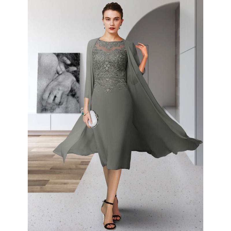 Be the first to review “Two Piece Sheath / Column Mother of the Bride Dress Elegant Jewel Neck Tea Length Chiffon Lace Sleeveless with Appliques” Cancel reply