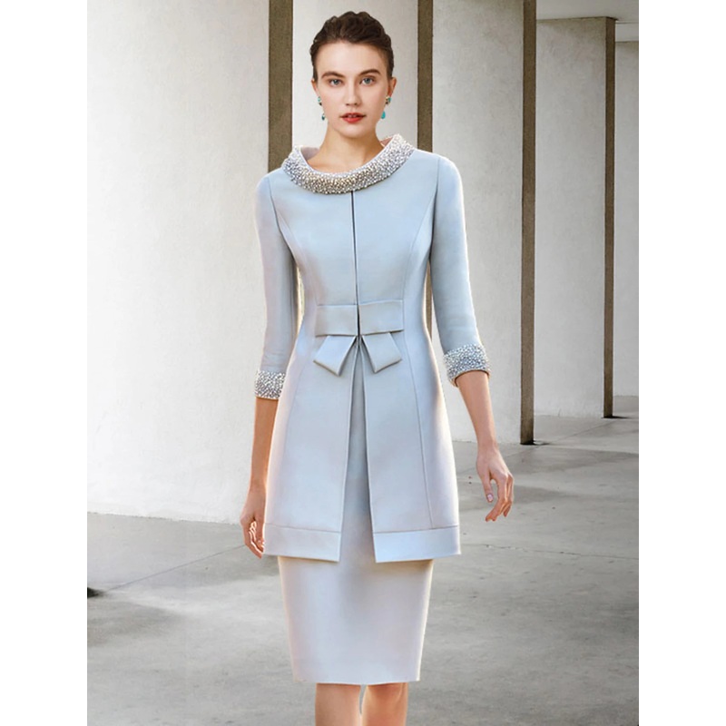 Two Piece Sheath / Column Mother of the Bride Dress Fall Wedding Guest Church Elegant Jewel Neck Knee Length Satin Cap Sleeve Jacket Dresses with Sash / Ribbon Bow(s) Beading