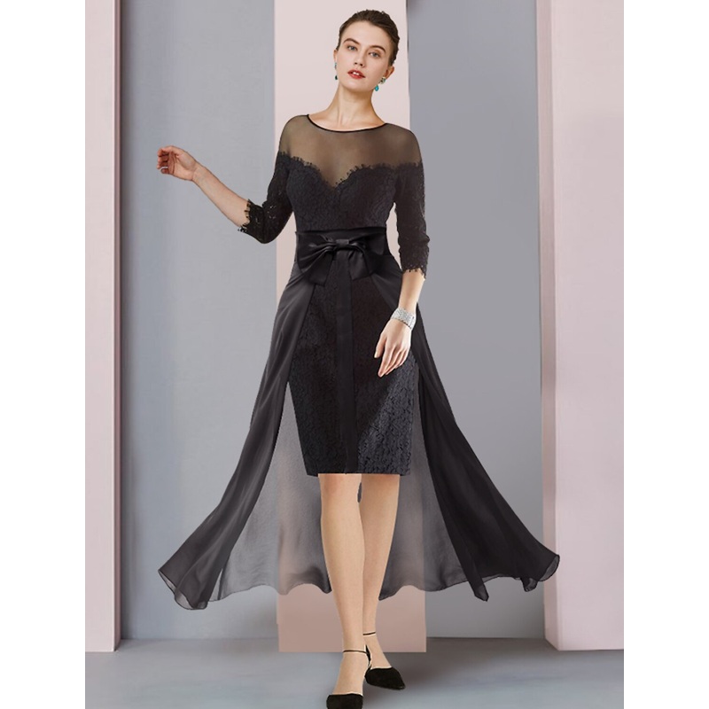 Two Piece Sheath / Column Mother of the Bride Dress Formal Wedding Guest Elegant detachable Scoop Neck Knee Length Chiffon Lace 3/4 Length Sleeve with Bow(s) Applique