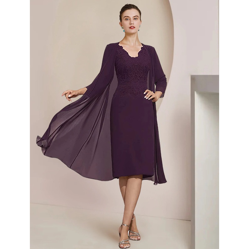 Two Piece Sheath / Column Mother of the Bride Dress Formal Wedding Guest Elegant V Neck Knee Length Chiffon Lace Short Sleeve Jacket Dresses with Appliques
