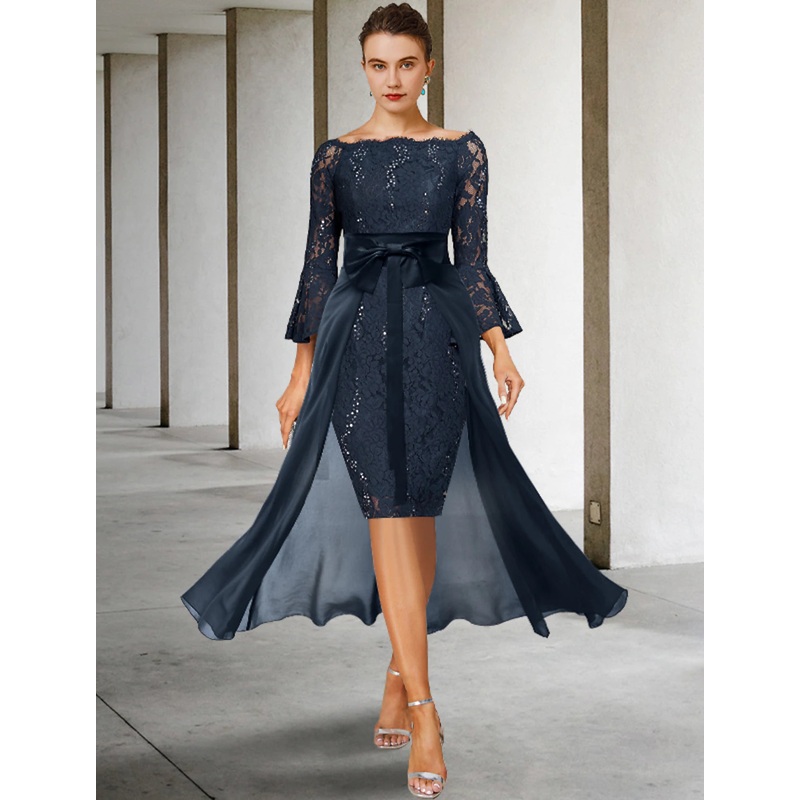 Two Piece Sheath / Column Mother of the Bride Dress Formal Wedding Guest Party Elegant Off Shoulder Knee Length Chiffon Lace Imitated Silk 3/4 Length Sleeve with Bow(s)