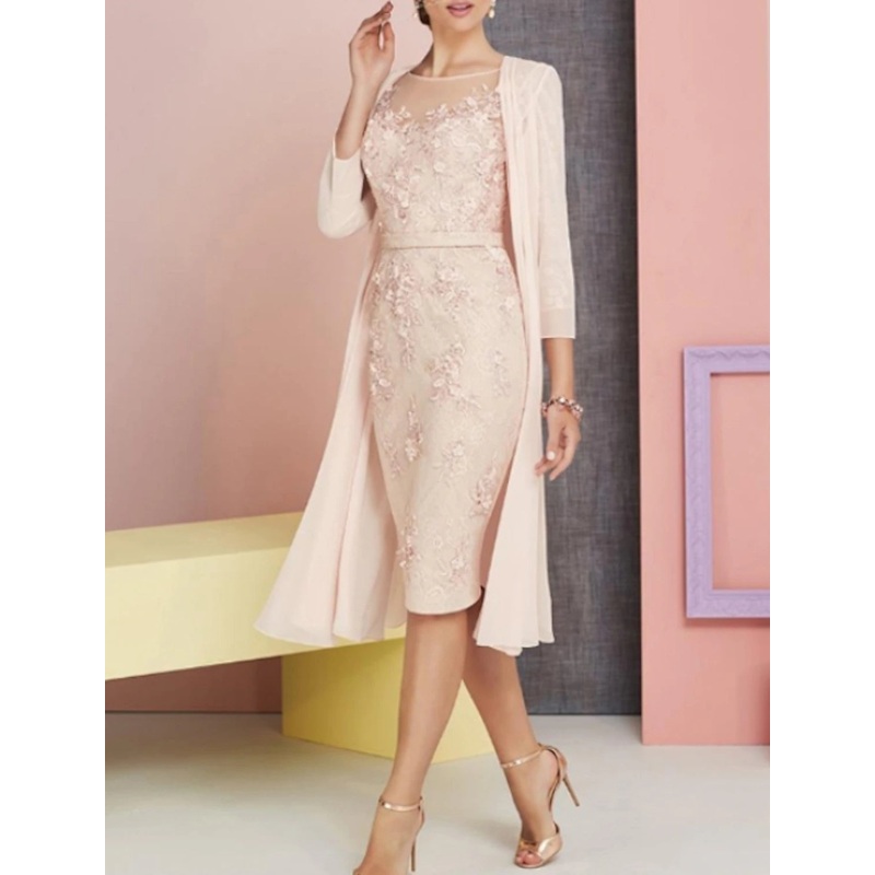 Two Piece Sheath / Column Mother of the Bride Dress Wedding Guest Church Elegant Vintage Plus Size Bateau Neck Knee Length Chiffon Lace 3/4 Length Sleeve Jacket Dresses with Appliques