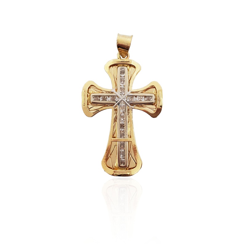 Precious Metal: 14 KaratYellow and White Gold.Gemstone:Cubic Zirconia.Color:WhiteHeight: 35.10 mm (with bail)Width: 20.25mmAvailable Weight: ~ 1.8 grams*To check availability in other sizes and designs please inquirevia e-mail or Instagram DM if necessary.