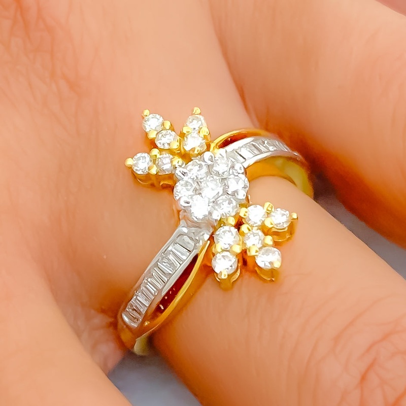 This exquisite 18k gold ring, weighing 4.4 grams, combines a sophisticated two-tone finish with a stunning floral design. Adorned with 0.71 carats of F-G color, VS-quality diamonds in round and baguette cuts, it exudes a refined sparkle and elegance. The c