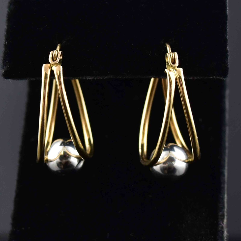 These stunning vintage 9K yellow gold double hoop earrings feature a solid white gold ball at the center, giving a fresh take on a timeless design. Their excellent condition makes them a must-have for any fashion-forward individual.