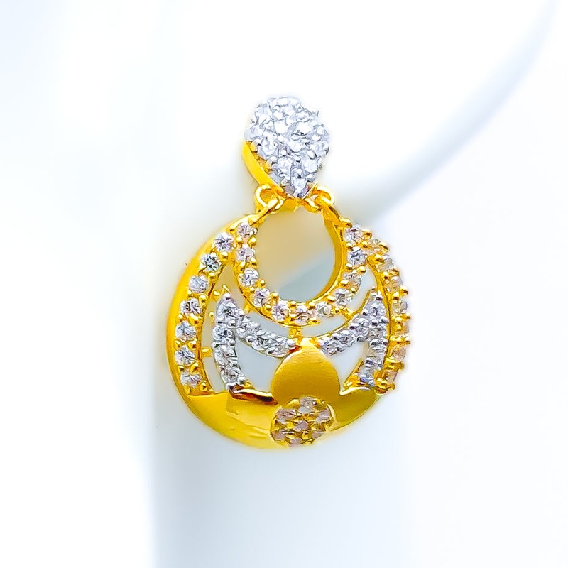 Step into the world of sophistication with our Two-Tone Satin Flower Earrings. Crafted in 22K yellow gold, weighing 5.5 grams, these earrings are a testament to exquisite craftsmanship. Adorned with cubic zirconia stones, their captivating two-tone design