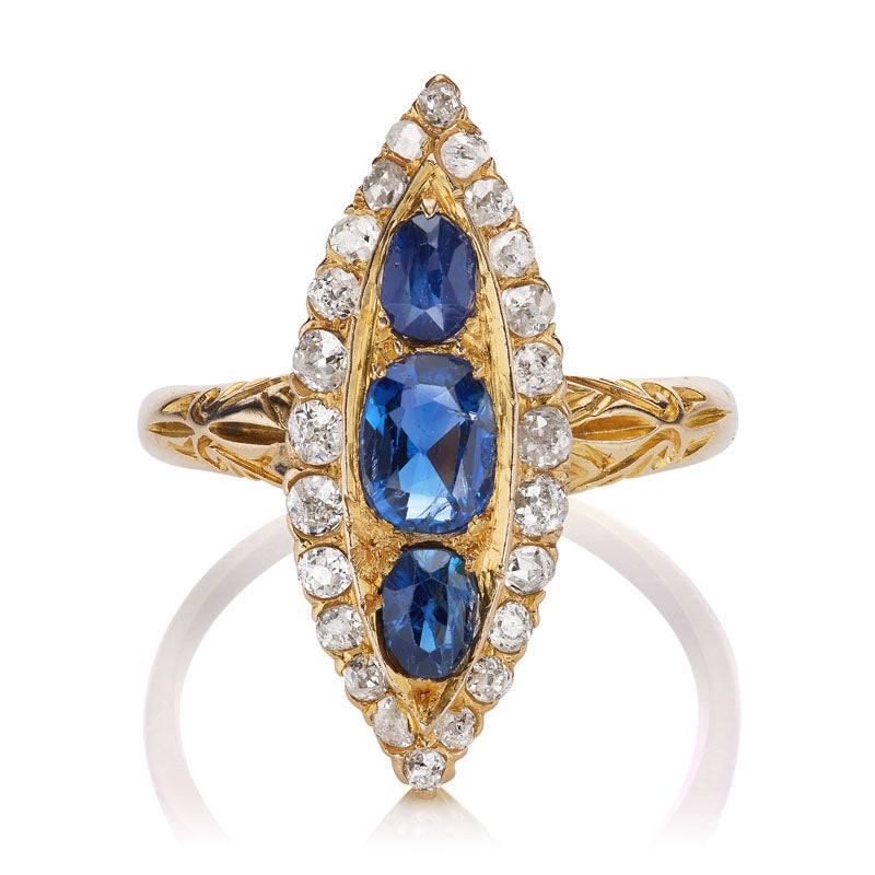 A glimmering halo of antique stones pairs beautifully with this bold and engraved band.The vibrant sapphires glow amidst this navette shaped beauty.
