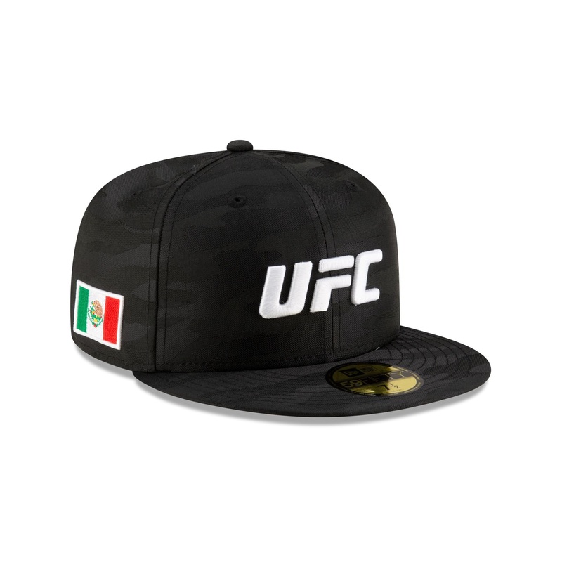 The UFC Mexico Black Camo 59FIFTY Fitted Cap features an embroidered UFC logo at the front panels with a Mexican flag at the right-wear side and a gray undervisor.
