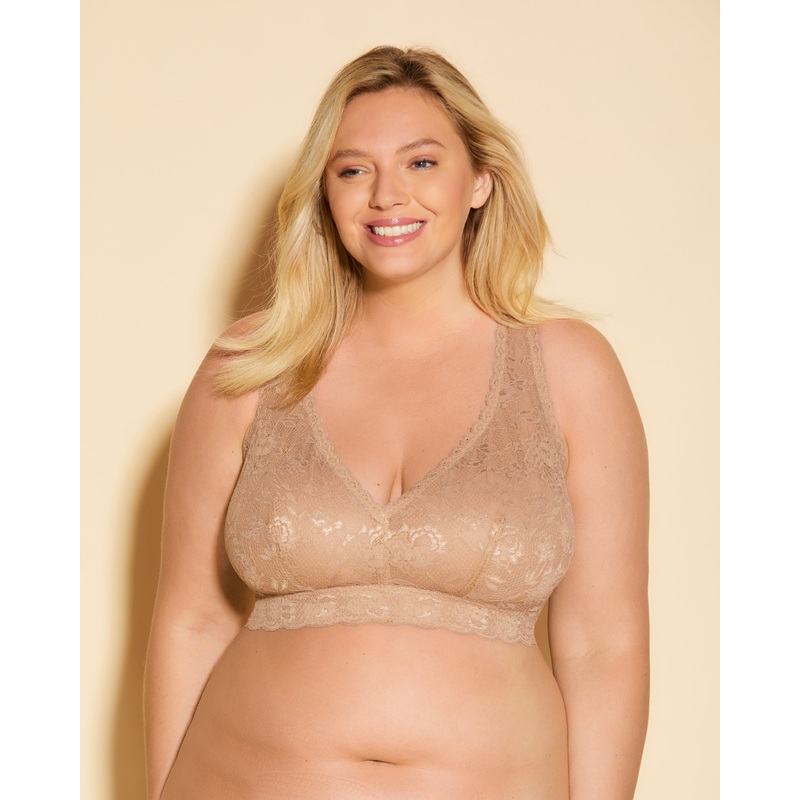 Wireless racerback bralette designed for ultra-fuller busts with smaller bands.Soft stretch, non-sheer scalloped lace lined with power mesh for support.V neckline and non-padded cups.Pull-on style.Wide, non-adjustable lace racerback straps.Body: 91% polyam