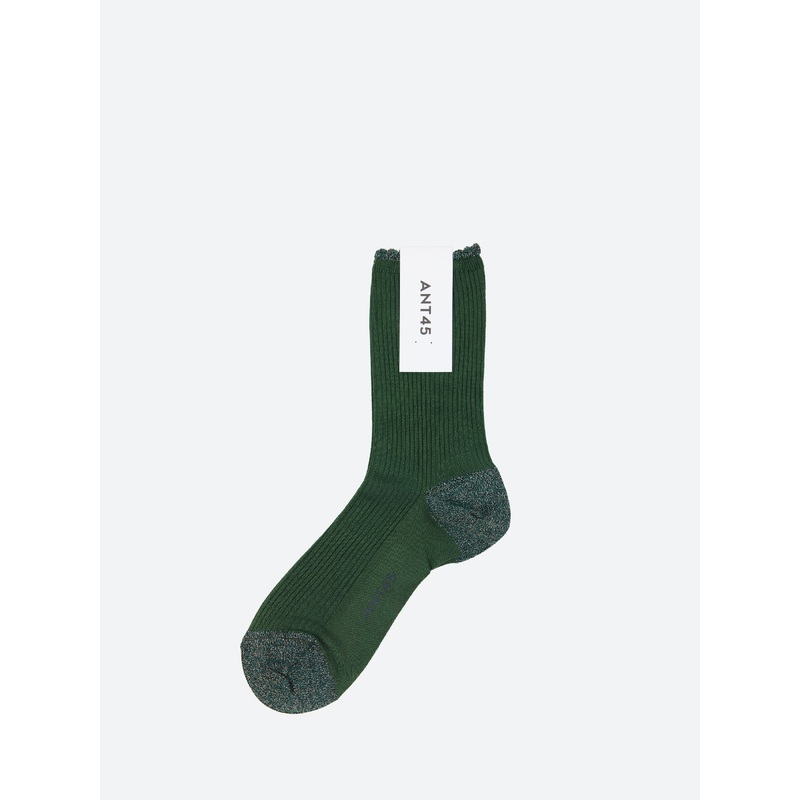 Short socks in ribbed viscose with contrasting lurex heel, toe, and gathered cuff.
