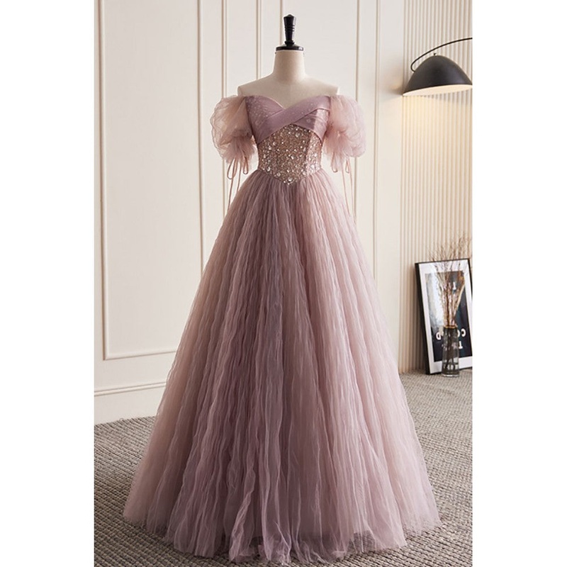 Unique and elegant dark pink sequin off the shoulder short sleeved ball dress dark pink A-line princess glitter beaded backless and ground length prom dress