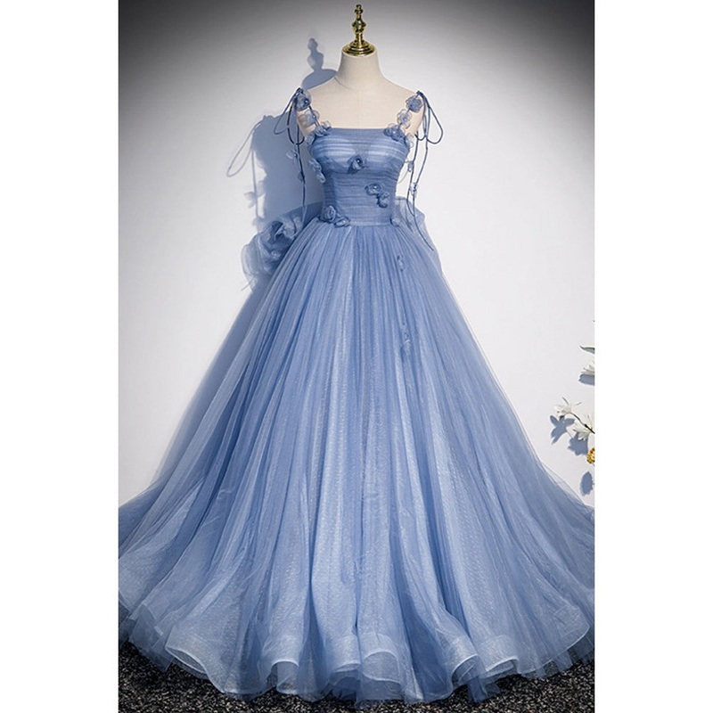 Unique and elegant sky blue decal thin shoulder strap off the shoulder ball dress sky blue A-shaped/princess bow sleeveless backless lace up and floor length style