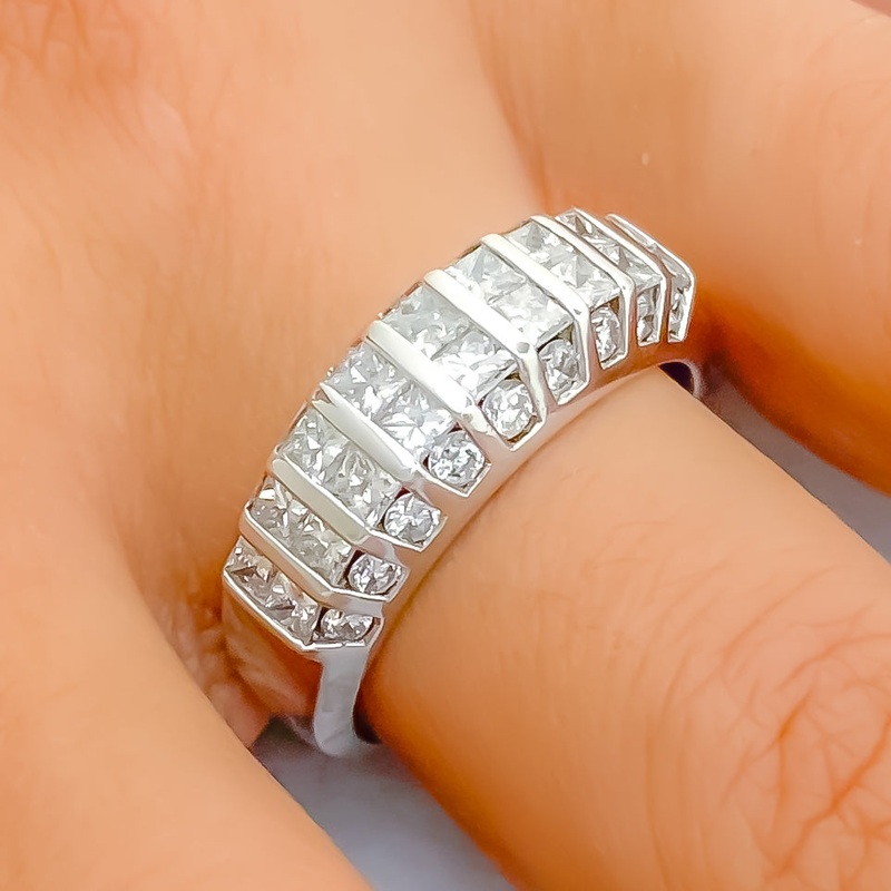 This striking 18k white gold ring, weighing 12.0 grams, features a unique striped design embellished with 2.18 carats of round and princess-cut diamonds in F-G color and VS quality. The combination of diamond shapes in a bold striped pattern adds depth and