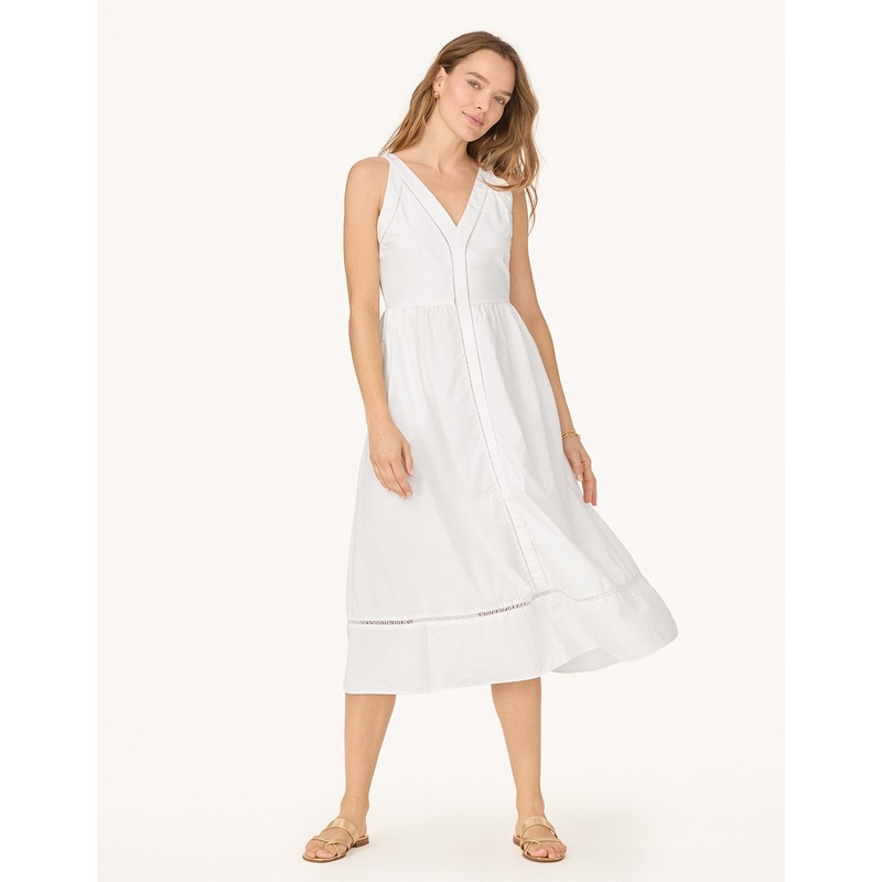 effortless and understated, this dress is a summery staple. we designed it from soft organic cotton with a flowy silhouette and elevated detailing.v-neck front and backladder trim detailingwaist seam with shirringinvisible center-back zipper with hook and