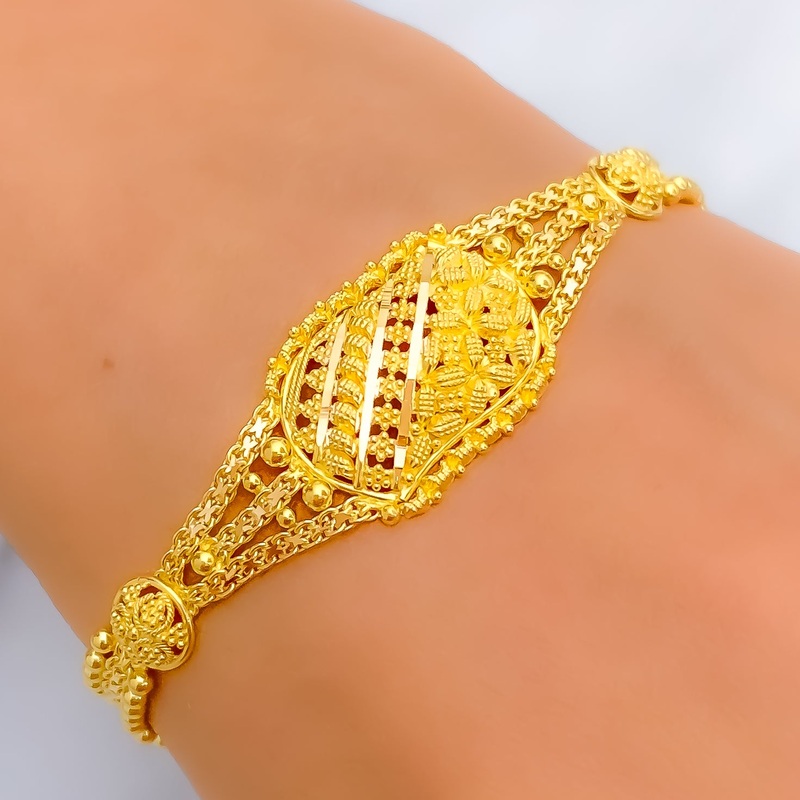 Designed for sophistication, this 22K gold bracelet features an elegant yellow gold finish that radiates timeless charm. Weighing 5.9 grams, it boasts a sleek 7.3-inch length with 0.75-inch adjustable links for a comfortable fit. The secure hook lock ensur