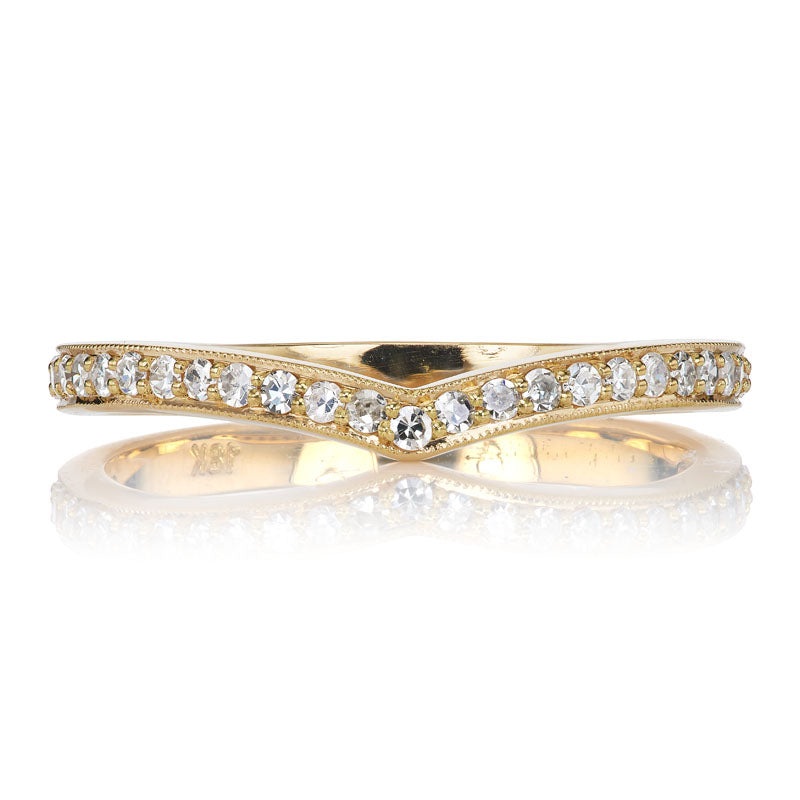 TheDiamond V Half HoopBand is a vintage-inspiredAB made diamond and gold wedding band. This band hassmall bead-set diamonds of approximately H-I color, VS clarity that wrap about three-quarters of the way around the band. The band is approximately 2 mm wide. This ring can be made in 18kt yellow gold or platinum.