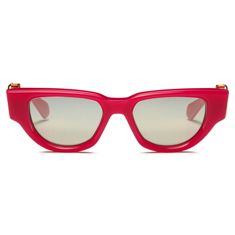 Inspired by the iconic narrow sun style that became synonymous with the avant-garde arts and entertainment scene, the Valentino // Due is an audacious reinterpretation through the lens of todays pop culture. A modern cat-eye shape thats subtly sophisticated yet screams with youthful exuberance, Valentino Due is crafted of the finest chunky Japanese acetate in custom couture-inspired clear and opaque hues including the limited edition pink colorway. Valentino Due features innovative tridimensional titanium VLogo Signature buckle-style temple embellishments that are removable for a variety of looks, richly sculpted Valentino Rockstud-inspired temple tips, high-quality sun lenses in complementary tones, and incomparable Made in Japan craftsmanship. Handmade in Japan. Includes Valentino box, hard case, soft case, cleaning cloth, and 1-year manufacturer warranty.