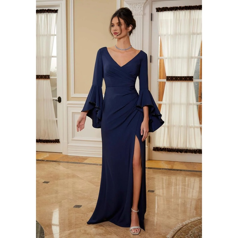 V-neck flared sleeve side slit and floor length mother of the bride dress