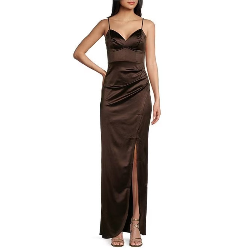 V-neck pleated side slit tight fitting corset prom dress