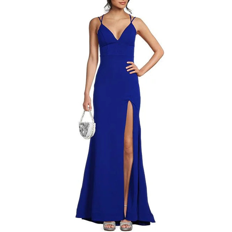 V-neck strap with front slit and long evening dress