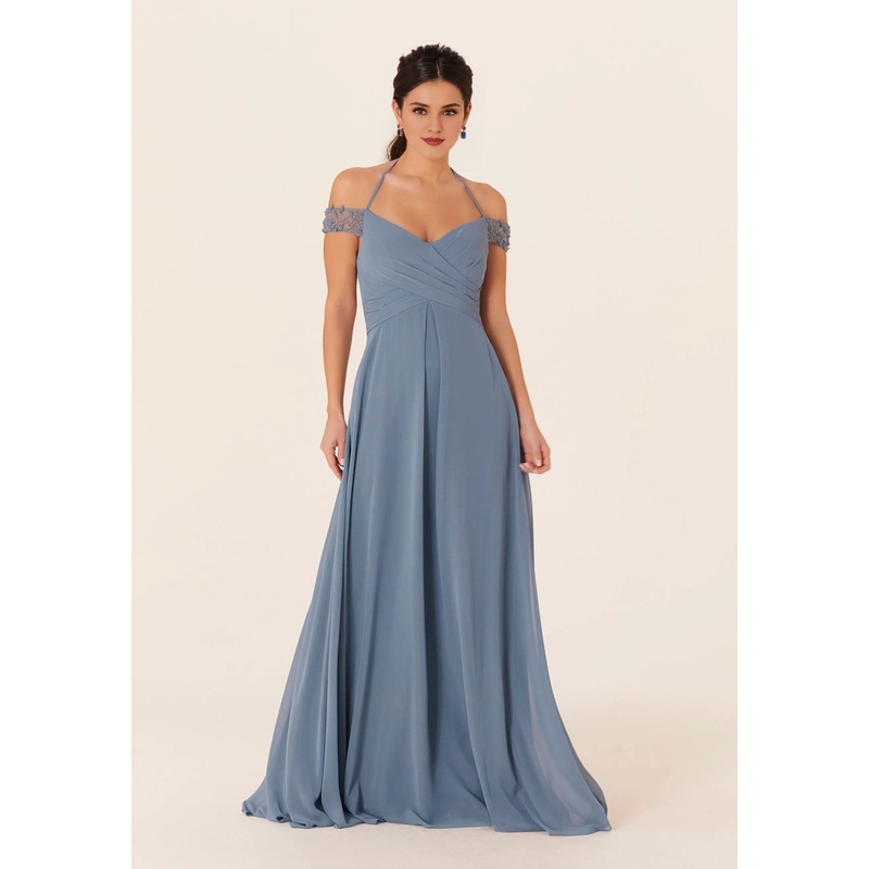 V-neck tight corset off shoulder chiffon bridesmaid dress