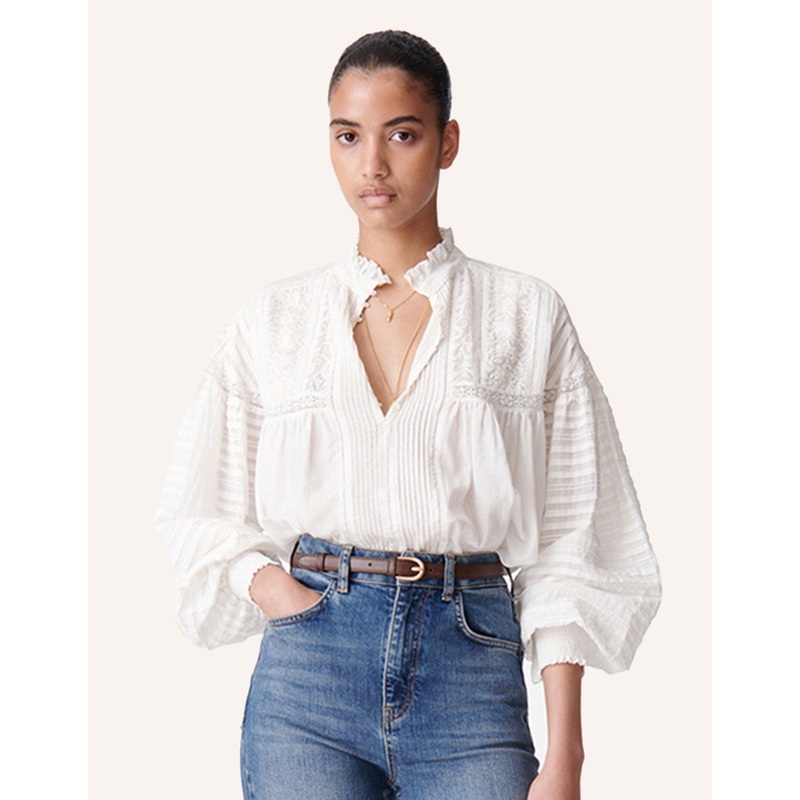 vanessa bruno clothing and accessories are free, modern, timeless and naturally beautiful, bringing together the comfort and romance that embody parisian allure.High, ruffled round neckPleated sleeves and shouldersRuffled chest detailsEmbroidery, inlaid la