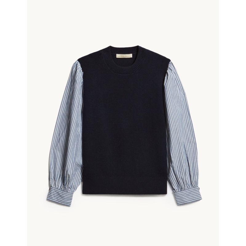 vanessa bruno clothing and accessories are free, modern, timeless and naturally beautiful, bringing together the comfort and romance that embody parisian allure.Wool jumper with cotton shirt sleevesRound neck ribbed jumperBlue and white striped shirt sleev