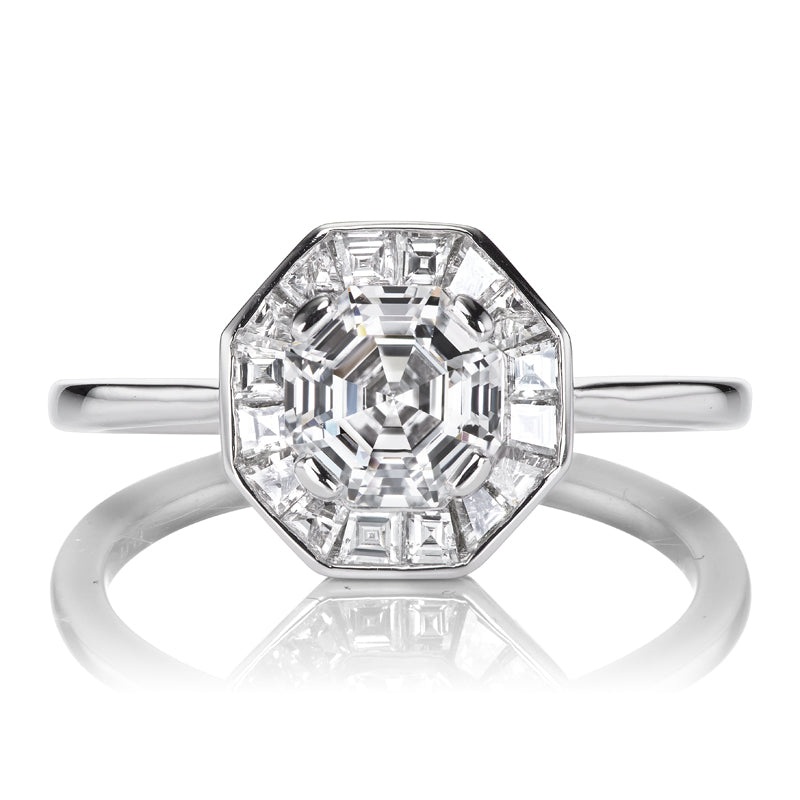 1 Carat Octagonal Step Cut Diamond with Halo in Platinum SettingThe Velaris 1.00 ring is an AB original design made right here in NYC. The ring centers a GIA-certified 1.00-carat Octagonal Step Cut diamond of D color, VS2 clarity. The center stone is surro