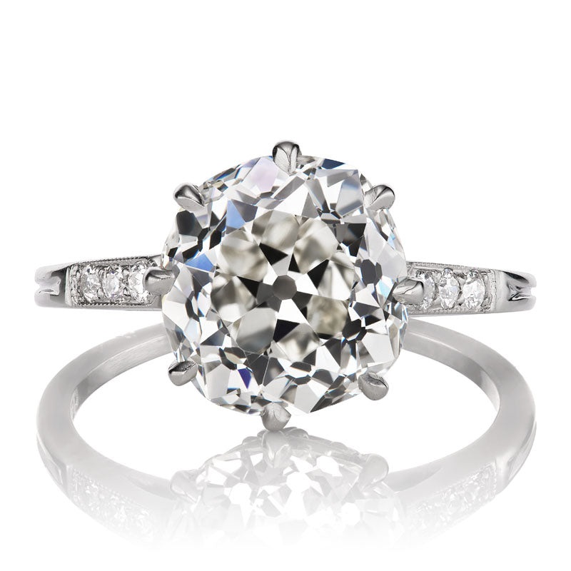 The Verona 4.28 ring is an AB original design made right here in NYC. The ring centers a GIA-certified 4.28-carat old mine cut diamond of J color, VS2 clarity. The stone is set in an 8-prong platinum setting with three small old European cut diamonds on each shoulder. The ring is currently size 4.25 and can be resized!