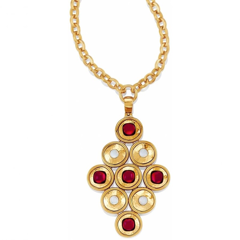 The Duchess of Burgundy was the inspiration for this stunning statement piece. Its pendant mimics the fluidity of water, and shines marvelously In hammered gold and German glass.