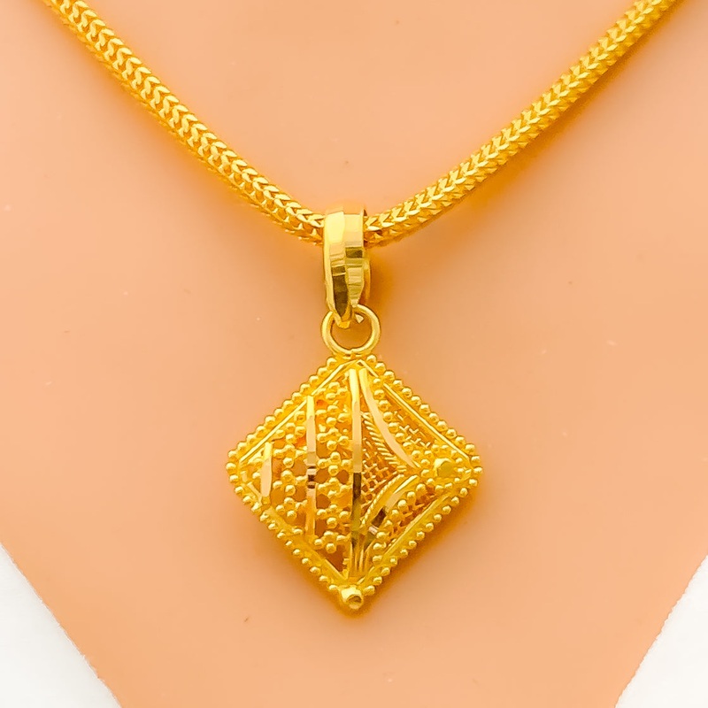 Crafted from 22k gold and weighing 2.3 grams, this pendant features a striking square mesh design with a polished yellow gold finish. The pendant measures 1 inch in length, making it a subtle yet elegant choice suitable for various styles and occasions. It
