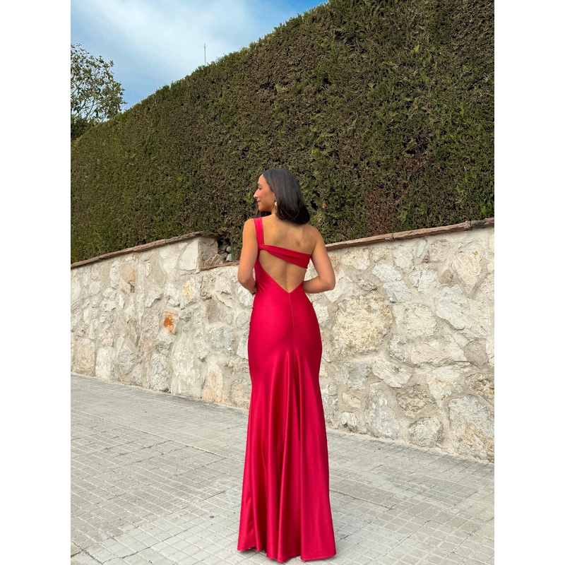 Vestido largo ajustado cola de sirena con abertura,escote asimtrico y espalda descubierta con detalle de nudo. Es elstico.