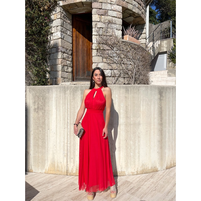Vestido largo de tulle. Escote cuello halter con abertura en el centro, botn para ajustar al cuello. Cintura ajustada con lazo y forro interior en la falda para no transparentar.Vestido largo para graduaciones, bodas y eventosTalla nica ( de la 32 a la 42)