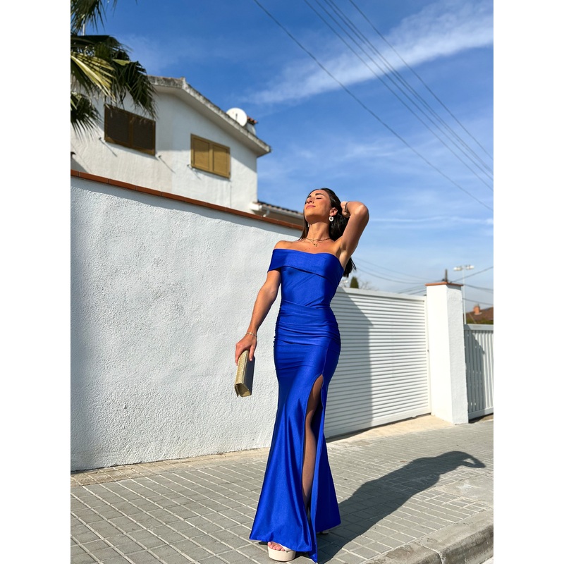 Vestido largo ajustado cola de sirena con abertura, escote tipo barco asimtrico con un brazo descubierto y banda en el pecho acabada en brazo. Detalle de banda en la parte del abdomen. Es elstico.