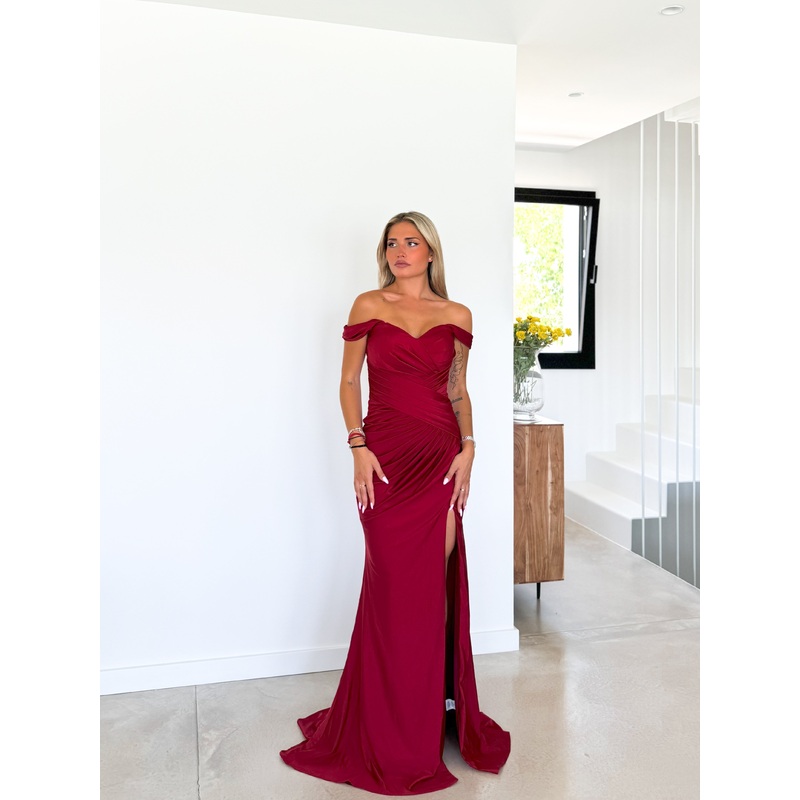 Vestido de escote barco con manguitos y copas en el pecho. Diseo de frunce cruzado en el abdomen. Cola larga. Raja en la falda .Cierre con cremallera invisible.