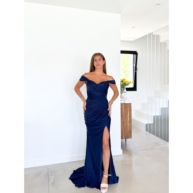 Vestido de escote barco con manguitos y copas en el pecho. Diseo de frunce cruzado en el abdomen. Tiene cola larga. Raja en la falda .Cierre con cremallera invisible.