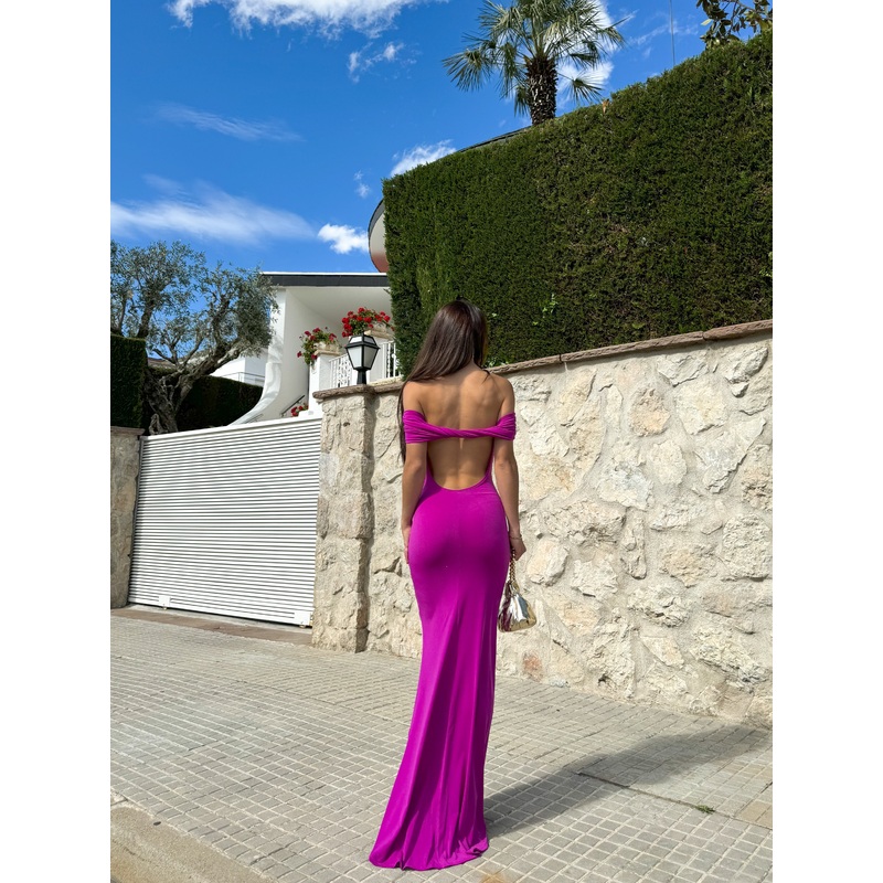 Vestido largo de escote bardot cruzando la espalda, detalle de abertura en la espalda. Corte tipo sirena y es elstico.