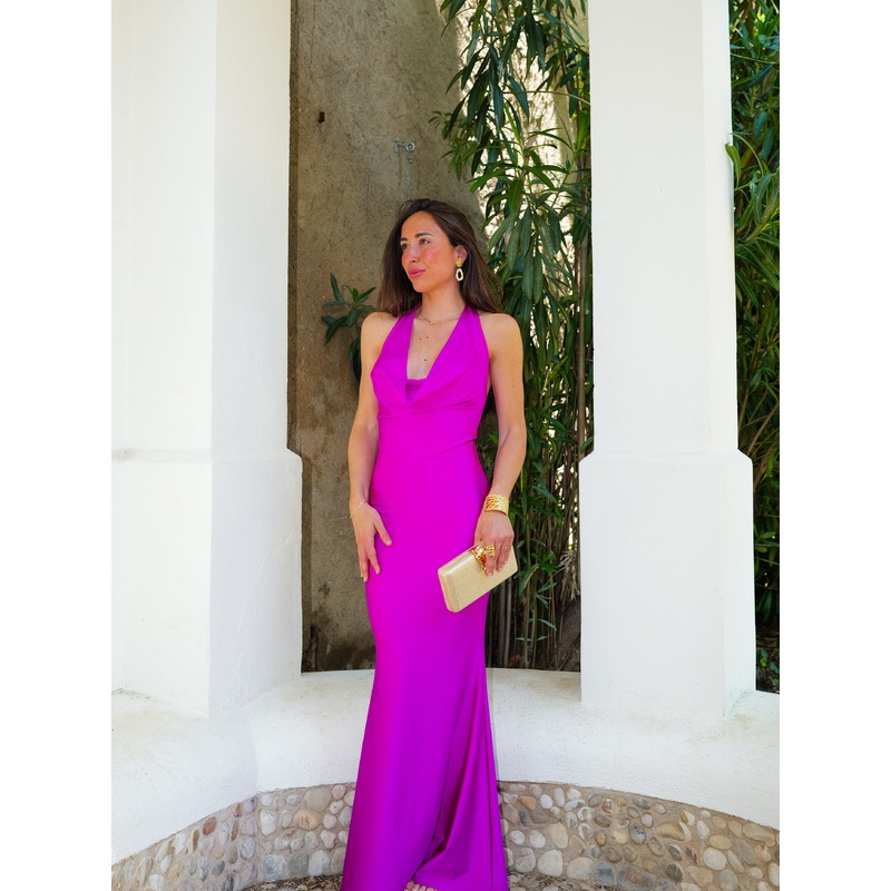 Vestido largo de escote cascada anudado al cuello.
